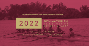 A toast to the 2022 Scotch 1st VIII Crew will be proposed by Ben Strang, Captain of Boats 2021. A viewing of Scotch Rowing Memorabilia will also be available on the night.